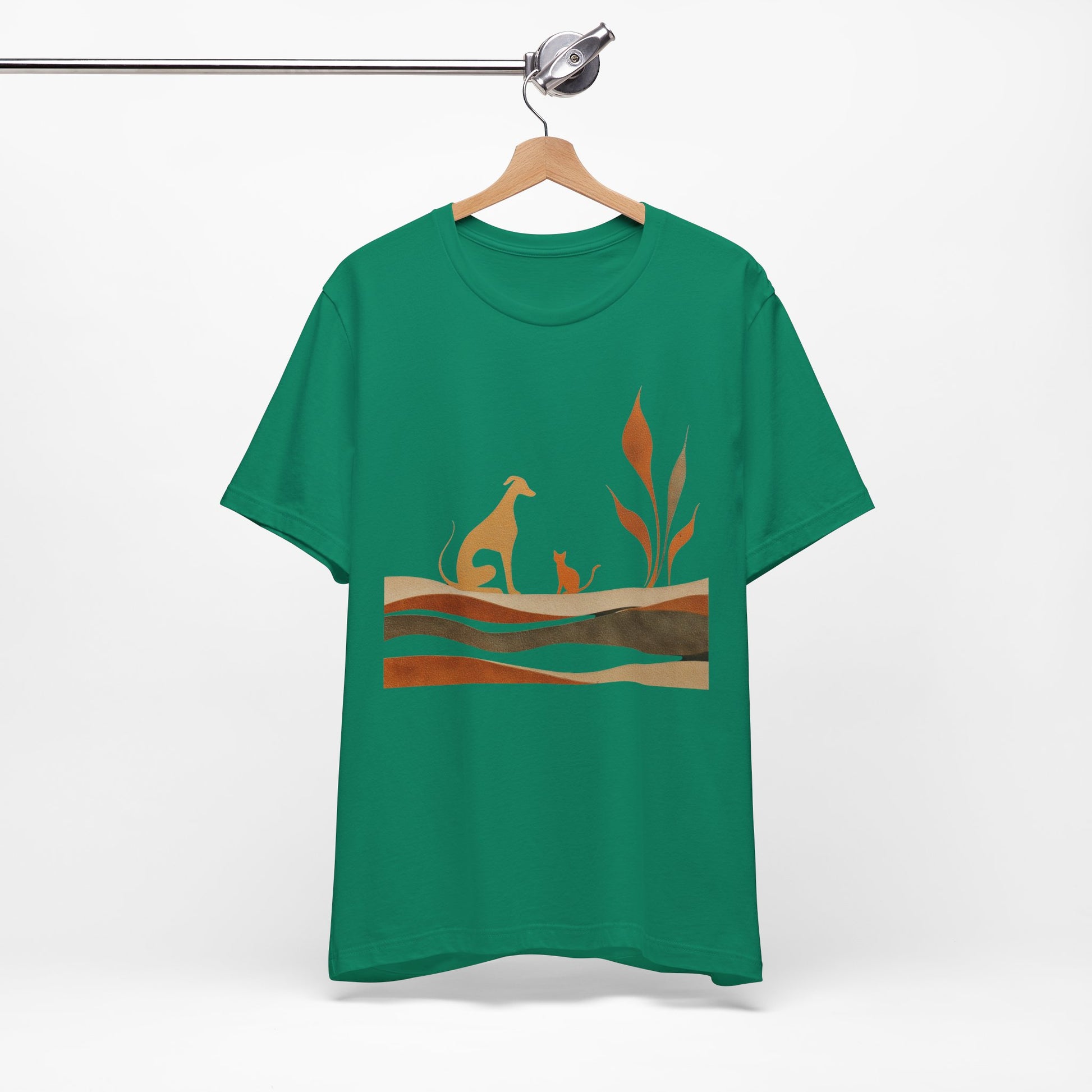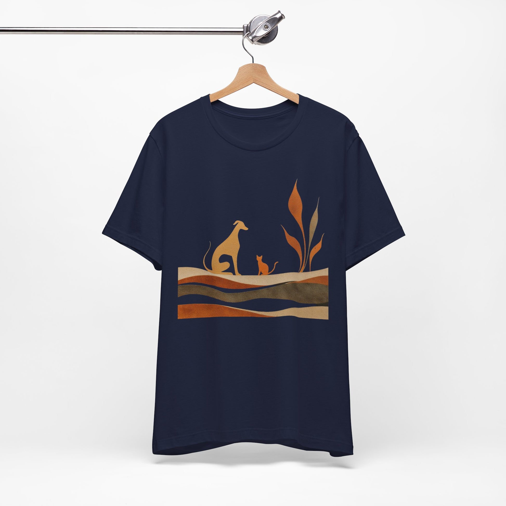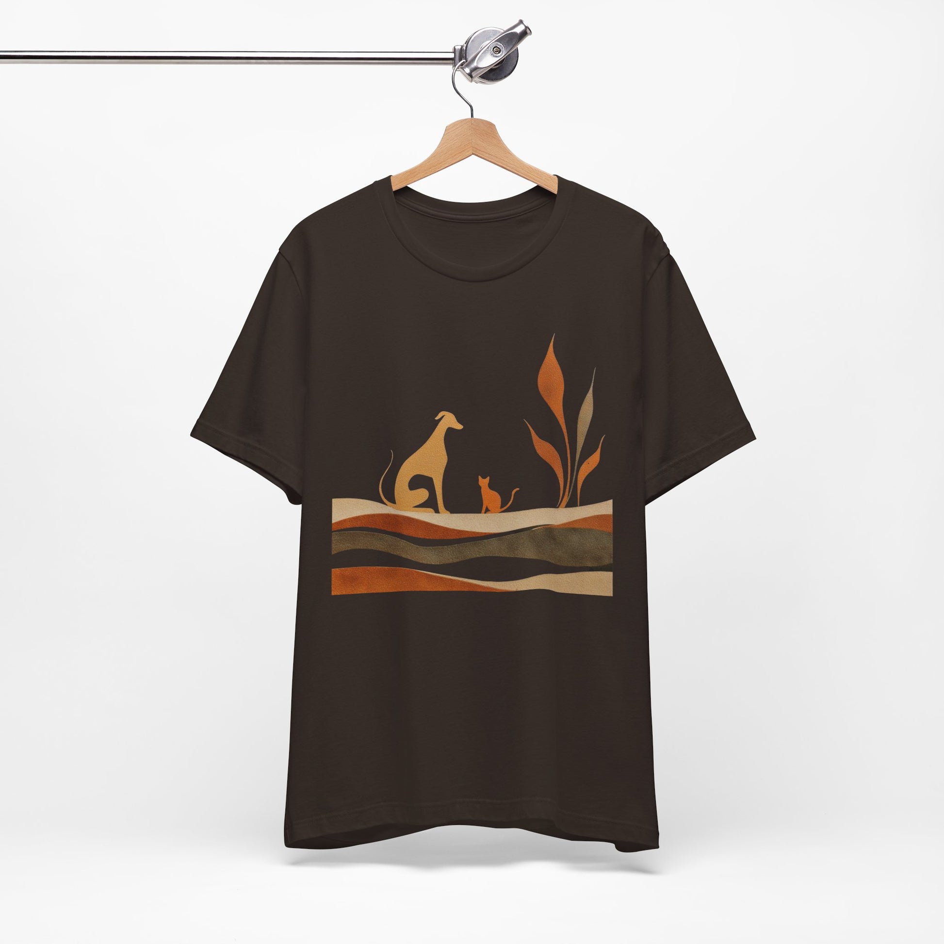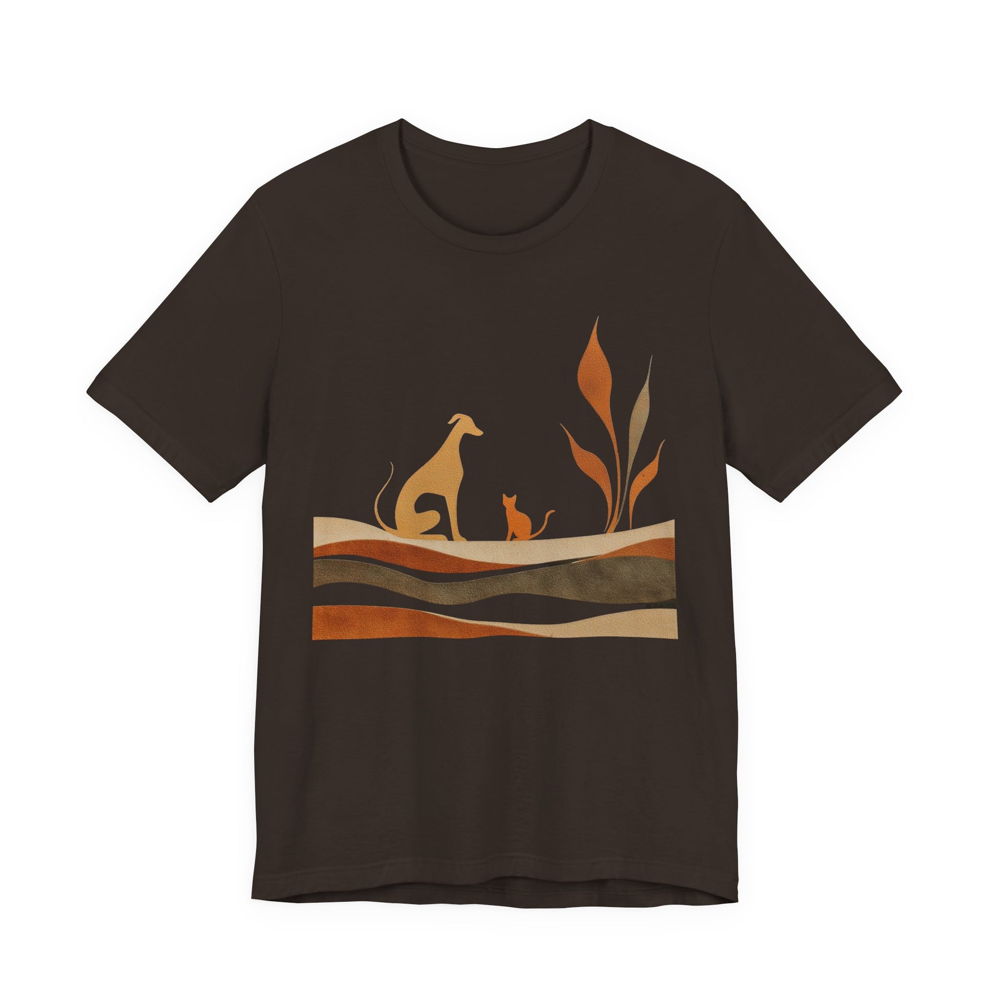 This soft, lightweight tee captures a quiet, earthy mood with warm rust tones and muted greens forming a layered landscape. A graceful dog and its small companion rest among stylized foliage, evoking a calm, shared moment of simply watching the world pass by.